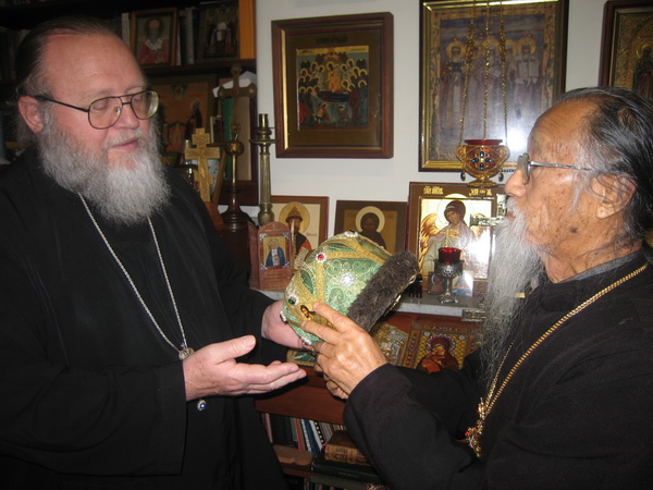 Митрополит Иларион показывает митру святителя Иоанна Шанхайского о. Михаилу ЛиМитрополит Иларион: Да, теперь уже мы получаем оттуда книги. Теперь мы не должны проявлять такие усилия для их издания здесь, поскольку дешевле в России печатать. Поэтому мы имеем возможность больше заниматься печатанием литературы на местном языке — английском или другом.