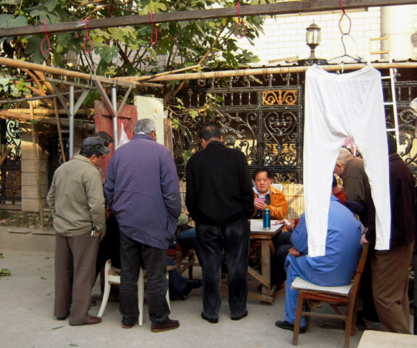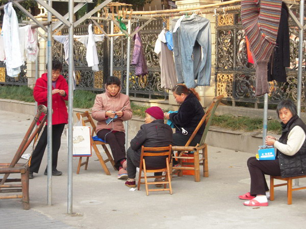 Здесь на улицах мужчины играют в шахматы. Собираются целые толпы поглазеть и дать дельный совет. Вообще китайцы очень любят играть в шахматы и домино – это почти национальное развлечение. Рядом женская команда – дружно что-то вяжут и моют…..косточки.
