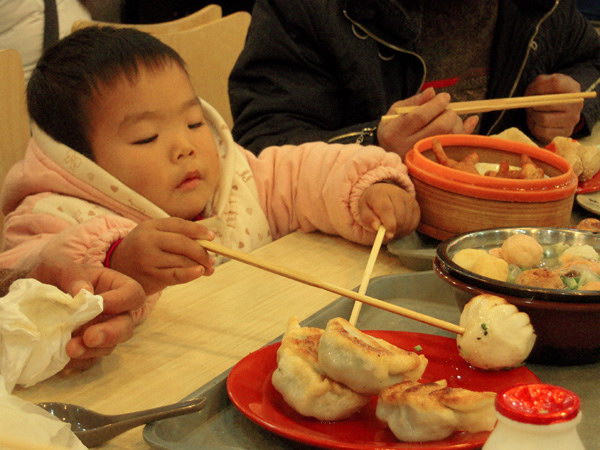 Здесь открытые кухни, с раковинами на улицах. В кухни лучше не заглядывать слабонервным, потому что срабатывает естественный рефлекс желудка, когда мозг осмысливает увиденные закопченные и замасленные тазы, сковородищи, ржавые трубы и засаленные раковины с открытой канализацией в полу. Но Китайцы не заморачиваются, вместо того чтобы мыть и чистить они просто дезинфицируют еду – варят и сильно жарят ее. Так что я говорю своему желудку : «Спок! Китайцы выживут, а ты можешь перетерпеть обед на печеньках» Они готовят тут же на уличной кухне, рядом стоят незамысловатые столы и едят все вместе. Хотя для китайцев нет культа еды, поэтому они довольны и схваченным на бегу жареным шашлычком, которые они делают из всего. Они едят на ходу, остановившись посреди улицы. А столовые приборы – это две деревянные палочки и пластмассовая глубокая ложка – даже в самых изысканных китайских ресторанах. А простые люди могут орудовать двумя палочками как экскаваторным черпаком, загребая пищу в рот подставленный прямо к тарелке.