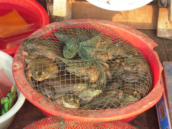 Впереди широкая для коммуналки улица, выхожу и попадаю на рынок в самый час пик. Все суетятся, что-то выбирают в корзинах на земле и прилавках с мясом, сушеными морепродуктами и еще чем-то. В тазах плавают рыба и крабы. Продавец ловко вылавливает краба и тут же заматывает его бамбуковым листом, придерживая конец зубами. Так ловко, что кажется это его основное ремесло. В других емкостях змеи, и упс, вон тазы с …..жабами.
