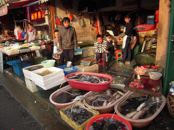 Вокруг суматоха, торговля, мотоциклисты и тачки. Здесь пульсирует реальная жизнь Китая. Если вам нужно что-то купить, спросите цену и улыбнитесь…. Это цена для «белых обезьян». Поэтому не тушуйтесь и называйте свою мизерную цену. Правило работает везде, не только на рынках. Реальную цену вы узнаете, поторговавшись и получив китайский прайс, который примерно в 5 раз меньше. Правда я не рискнула ничего покупать на рынке, видимо мой мозг тотально довлеет над желудком.