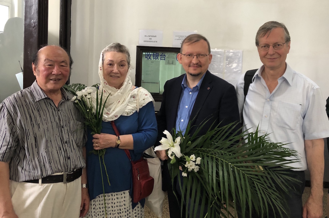Слева направо: псаломщик Папий Фу Силян, Марианна Мандрыгина, Михаил Дроздов, Михаил Мандрыгин. Шанхай, Троица, 16 июня 2019 г.