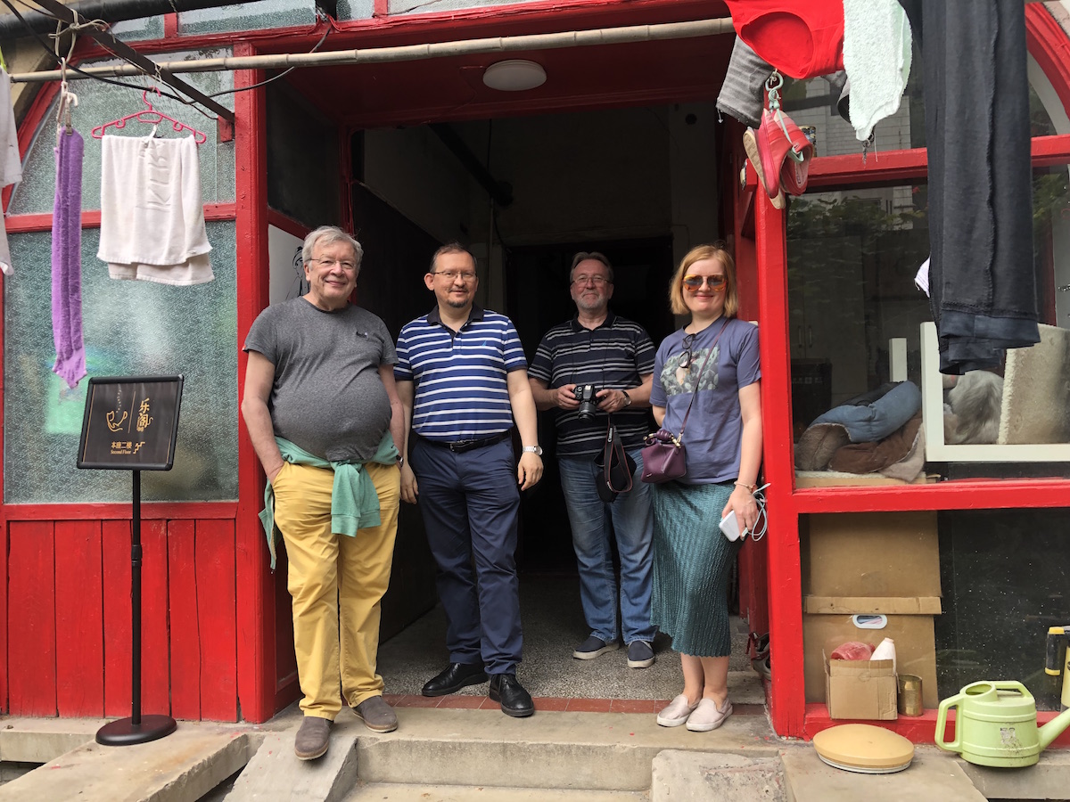 Постмодернист Виктор Ерофеев и реалист Евгений Анташкевич с «русскими шанхайцами» Михаилом и Александрой Дроздовыми. Шанхай, июль 2019 г.