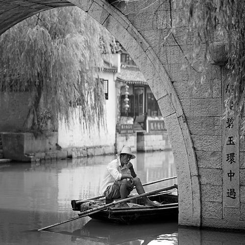 Впервые оказавшись на улицах Венеции Востока, Новиков фотографировал широкоугольным объективом. Как он сам признается: довольно прямолинейный подход, универсальный что ли. Действительно, широкоугольная оптика не предоставляет таких богатых возможностей композиционного выражения, как портретная и длиннофокусная. В кадр попадет все подряд, богатый мир деталей, которые так тонко характеризуют предмет или человека, теряется в ограниченном пределе разрешения объектива. Однако узкие улочки и каналы Чжоучжуана сначала не оставили Новикову другого выбора, кроме съемки широкоугольником. Возможно, тогда он хотел сформировать общую картину увиденного для себя, подтвердить подспудные догадки о том, что, наконец, нашел живое воплощение Китая из мифов. Впрочем, это нормальный процесс развития думающего фотографа. Сначала тебя занимают поиски соответствия собственного настроения, текущих жизненных установок тому, что происходит вокруг. Ты оттачиваешь методы его воплощения в фотообразах. Такие снимки будут, по сути, довольно эгоцентричными. В этом нет ничего плохого — ты растешь как художник. Но поступательный рост обязательно выведет на новые уровни творческого и личного развития, когда тебе захочется не просто рассказать людям о своих впечатлениях и мимолетных настроениях, а следовать в направлении эстетического объективизма. Широкоугольный объектив сослужил свою службу. В следующий раз Олег, вооруженный средней длиннофокусной оптикой, посетит Чжоучжуан, Ситан, Тунли и три других колоритных городка на воде.