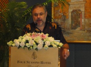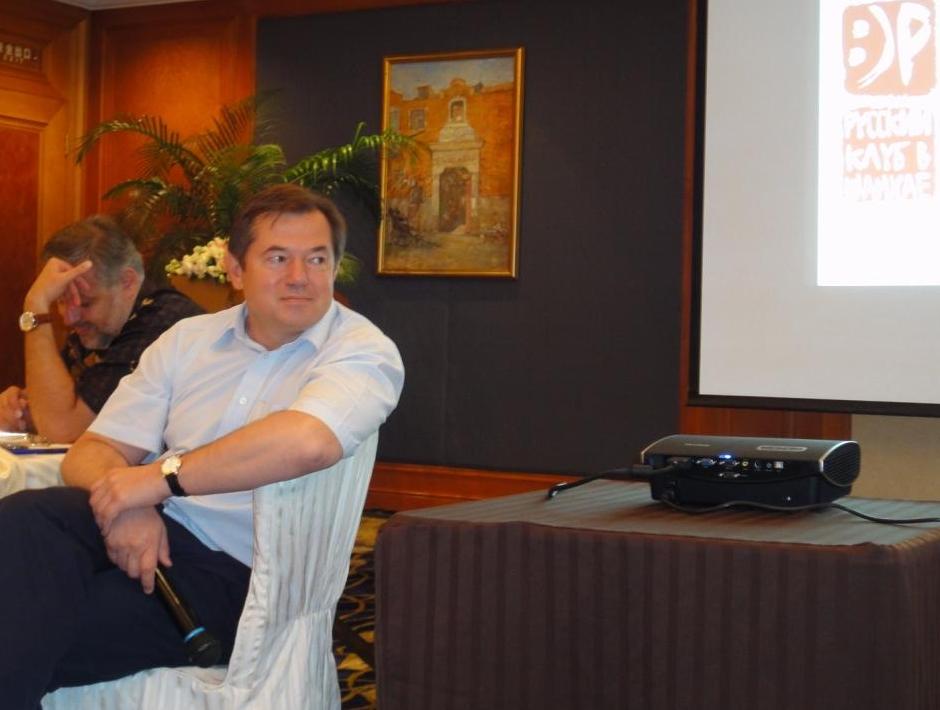 С большим удовольствием и гордостью за то, что такой человек к нам сегодня пришёл, я хотел бы представить Михаила Леонидовича Хазина. Думаю, вам он тоже известен, поскольку на сегодняшний день он является тем самым человеком, который знает о мировом финансовом кризисе больше, чем кто бы то ни был в современной России. В этой связи он сейчас очень востребован, его постоянно приглашают участвовать в разных телевизионных передачах, в газеты…. Справедливости ради замечу, что он мне сегодня признался, что некоторые газеты его уже не зовут, поскольку знают его любовь резать правду-матку. Но мы надеемся услышать именно такое ясное и правдивое мнение о том, что же нам ждать от финансового кризиса. Ведь у многих из нас, живя в Китае, складывается впечатление, что кризис достиг своего дна и вот-вот всё нормализуется. Так что с нетерпением будем ждать выступления Михаила Леонидовича.
