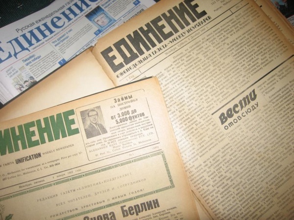 Владимир Кузьмин: Газета «Единение» — самая старая русская газета Австралии и одна из пяти самых старых газет русского дальнего зарубежья. Первый ее номер вышел в Мельбурне в 1950 году. Газета была создана сотрудниками Народного трудового союза (НТС), которые приехали в Австралию из Европы и из Китая во второй половине 1940-х гг. В те годы в Австралии не было ни одной русской газеты. Так что была большая потребность в издании, которое объединяло бы русских. Главные цели такого издания, конечно, были политические. То есть, помимо объединения русских ставилась и цель борьбы с коммунизмом. И вот на этих принципах газета развивалась довольно долго. У меня здесь в шкафу есть весь архив «Единения» за 59 лет.