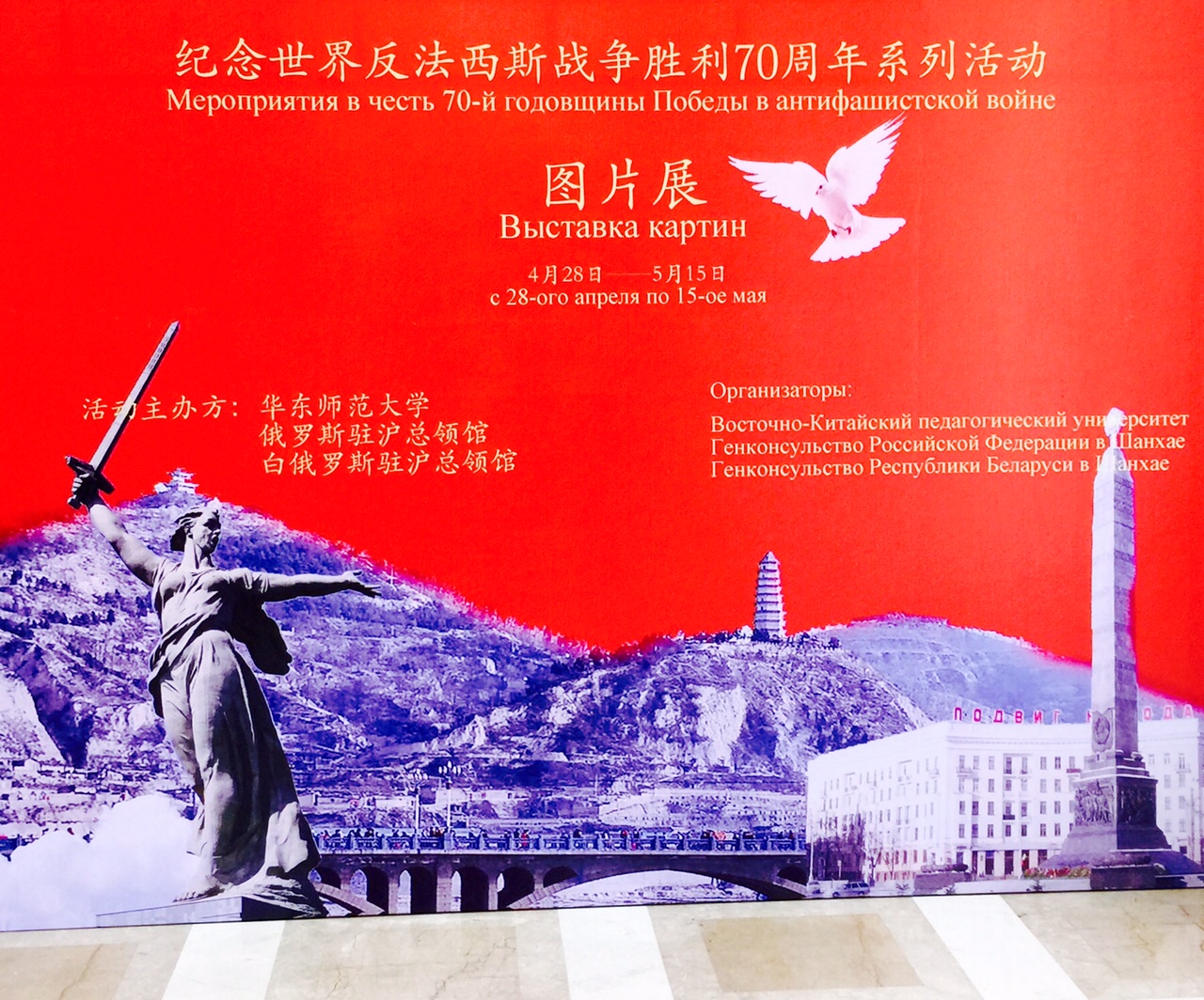 1. Выставка, приуроченная к 70-летию Великой Победы над гитлеровским фашизмом и японским милитаризмом, пройдет в Восточно-китайском педагогическом университете до 15 мая 2015 г. Организованная Университетом при поддержке Генконсульств России и Беларуси в Шанхае, она была открыта Геконсулами двух стран А.Н.Смородиным и В.М.Мацелем 28 апреля с.г.
