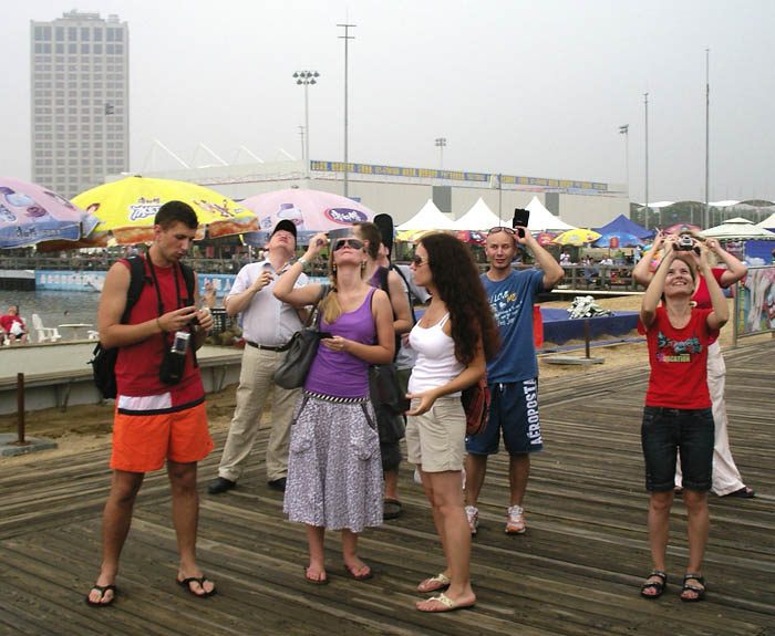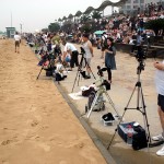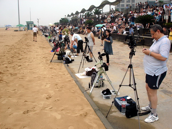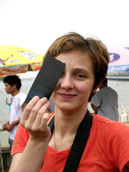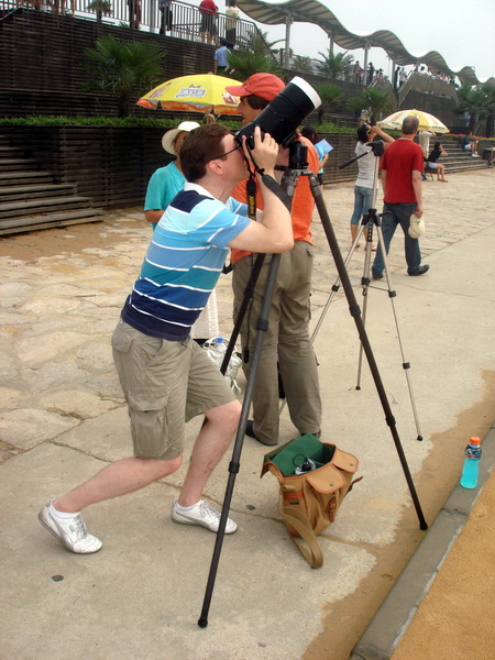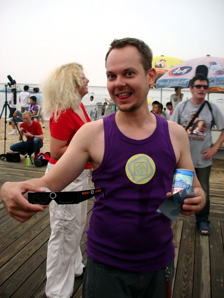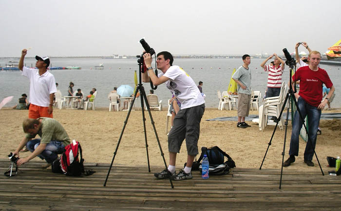 В Цзиньшане мы оказались в весьма удачном положении — пока в Шанхае лил дождь, мы успели таки наблюдать закрытие солнечного диска, пофотографировали. А когда полная фаза уже закончилась и выглянул тонкий серпик солнечного диска, гроза накрыла и нас. Жаль только что солнечная корона была не видна. Слой облачности подзакрыл её в момент полной фазы! Все потом пошли купаться…