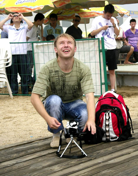 Спасибо Шанхайскому клубу за организацию, получилось просто восхитительно. Это третье полное затмение, которое я наблюдал. Второе смотрел при такой же погоде. В этот раз планировал пронаблюдать кольцевую зарю. Первая часть вполне получилась, так что я очень доволен! Ну и всё последующее тоже отлично дополнило картину — купание под дождём, волейбол и общение. Спасибо!