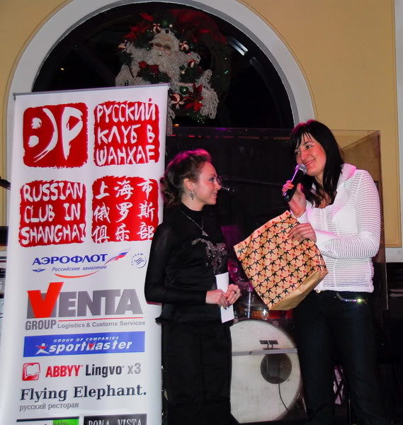 А что за Новый год без подарков? Благодаря щедрости спонсоров они возникали из волшебного дедморозова мешка непрерывно! Это и ваучеры на бесплатный ужин в ресторане «Flying Elephant», и всегда желанная одежда от «Спорт-Мастера», и незаменимый в экспатовском быту электронный словарь Abbyy Lingvo, и волшебная вода от Vitamin Water, и подписка на журнал на русском языке «Берега дружбы», и приглашения на ужин от сети баров Paulaner Braeuhaus, и предоставленные компанией Venta мобильный телефон iPhone и mp3-плееры, а также традиционный подарок от многолетнего спонсора новогодних вечеров РКШ — компании «Аэрофлот — Российские авиалинии» — авиабилет с открытой датой на рейс из Шанхая в Москву и обратно.