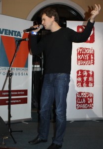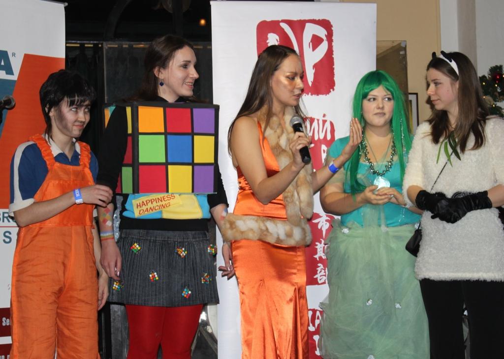 Нашлись у нас в клубе и свои таланты. Олег Рой из Харькова продекламировал стихотворение, девушка из Владивостока исполнила песню про Новый год, а танцевавшая на сцене пара в костюмах Марио и Луиджи получила купон на два бесплатных урока от школы танцев “Tango Go”. Но больше всех удивили и порадовали присутствующих, пять замечательных девушек — Гузель Мустафина, Александра Ищенко, Елена Ибрагимова, Ирина Масюк и Екатерина Соловьева, — которые исполнили под самостоятельно изготовленный ими клип «гимн Шанхаю». Именно они стали победителями конкурса «ЯТАЛАНТ!», и получили приз от гостиницы Le Meridian и 5 бутылок «Советского шампанского». Их выступление было признано лучшим в обеих объявленных номинациях, поскольку оно было самым интересным и самым сложным, с точки зрения времени затраченного на подготовку.
