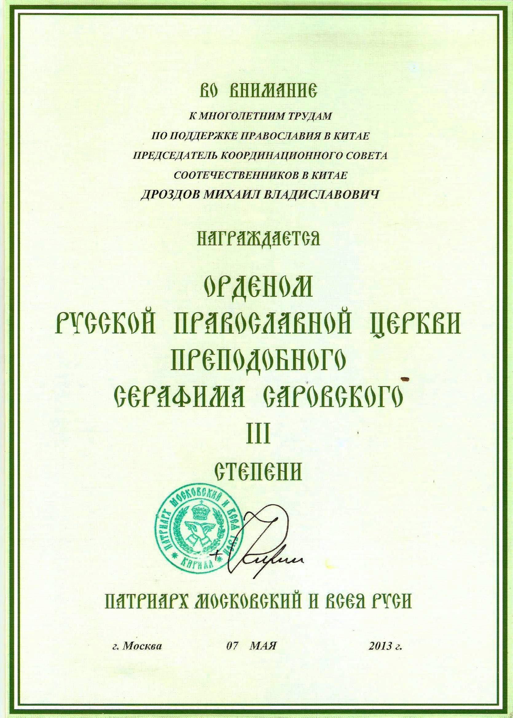 Во внимание к многолетним трудам по поддержке православия в Китае он наградил главу Русского клуба в Шанхае Михаила Дроздова орденом преподобного Серафима Саровского (III степени). Церемонию награждения завершил возглас «Аксиос!» («Достоин!»), произнесенный Патриархом и трижды подхваченный хором Новоспасского монастыря.