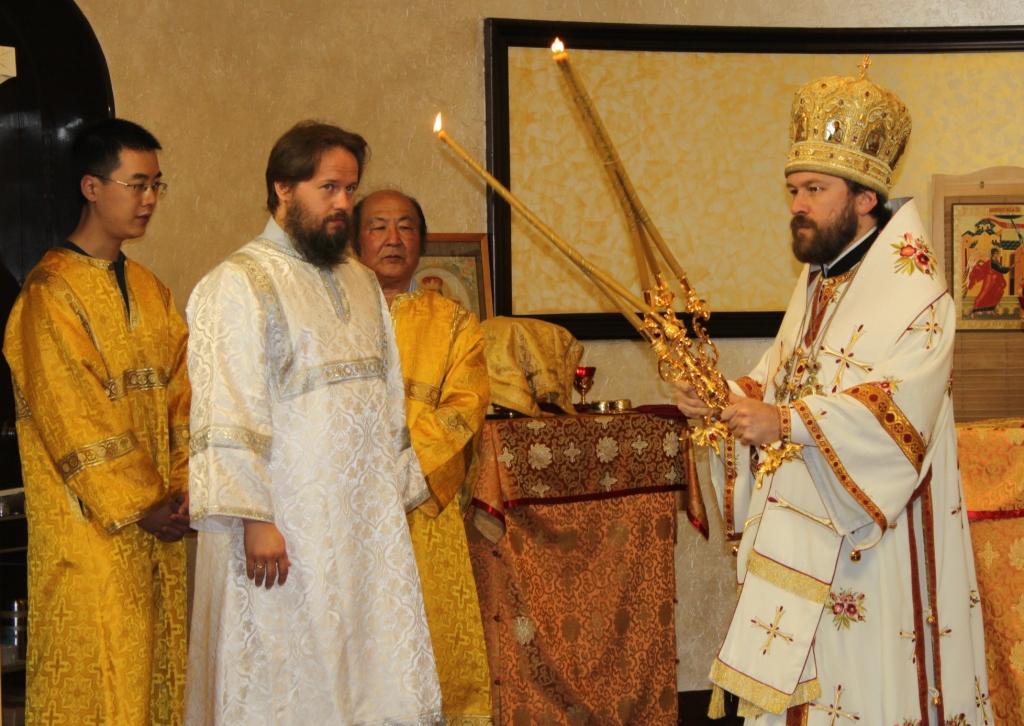On June 23, 2012, Metropolitan Hilarion, chairman of the Department for External Church Relations of Moscow Patriarchate, who is in China with the blessing of Patriarch of Moscow and All Russia Cyril and at the invitation of China’s State Administration for Religious Affairs (SARA), conducted a service at St. Nicholas church in Shanghai. At the entrance to the temple, Sunday School pupils presented Metropolitan Hilarion with flowers ; and on behalf of the community, M. Drozdov, President of the Russian Club, welcomed the DECR Chairman.