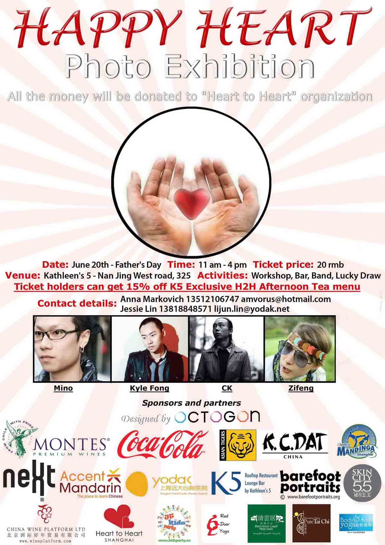 • Фотовыставка "Доброе Сердце" (Happy Heart) - афишаФотовыставка «Доброе Сердце» (Happy Heart) будет проводится 20-го июня с 11.00 до 16.00 в ресторане «Kathleen’s 5«, который расположен на 5 этаже Шанхайского Музея Искусств по адресу Nanjing West Road 325.