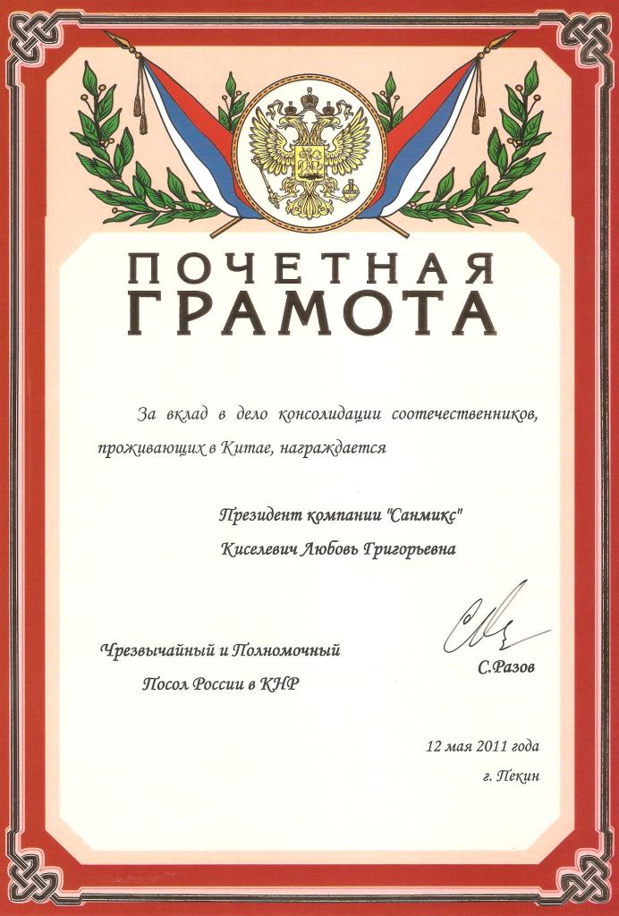 В рамках Пятой конференции российских соотечественников, проживающих в Китае, которая состоялась 12-13 мая 2011 г. в Пекине, прошла, ставшая уже традиционной, торжественная церемония награждения соотечественников. Эта традиция возникла в 2008 году, на второй конференции соотечественников, прошедшей в Шанхае. С тех пор ежегодно Чрезвычайный и Полномочный посол России в Китае отмечает отличившихся соотечественников почетными грамотами.