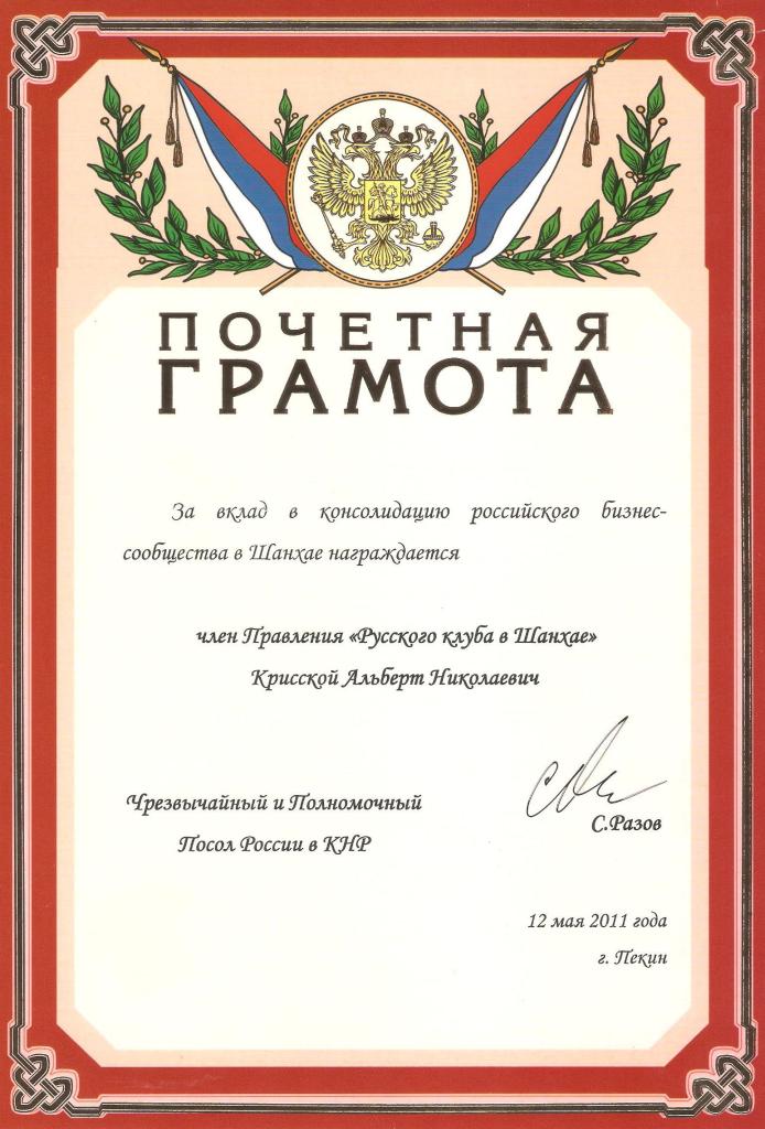 Итак, в 2011 году посол России в Китае С.С.Разов наградил почетными грамотами двух бизнесменов, активно содействующих реализации проектов, инициированных Русским клубом в Шанхае – президента компании «Санмикс» Л.Г.Киселевич и руководителя компании «Витекс» П.А.Любимова. Почетными грамотами были также награждены член правления Русского клуба в Шанхае А.Н.Крисской (за организацию и проведение в 2009—2011 гг. серии Деловых завтраков РКШ с участием известных российских политиков, экономистов, политологов и экспертов), а также ведущие очень популярного, полезного и познавательного медиа-проекта о Китае «Лаовайкаст» М.В.Иванов, С.С.Литвин и А.П.Мальцев. Прочтём до конца?