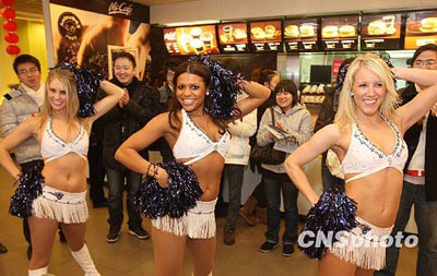 Девушки из команды поддержки станцевали на улице Наньцзин-лу 4-го февраля. Как сообщает газета «Жэньминь жибао», «страстный» танец был исполнен, чтобы создать горячую атмосферу перед финальным матчем кубка Super Bowl.